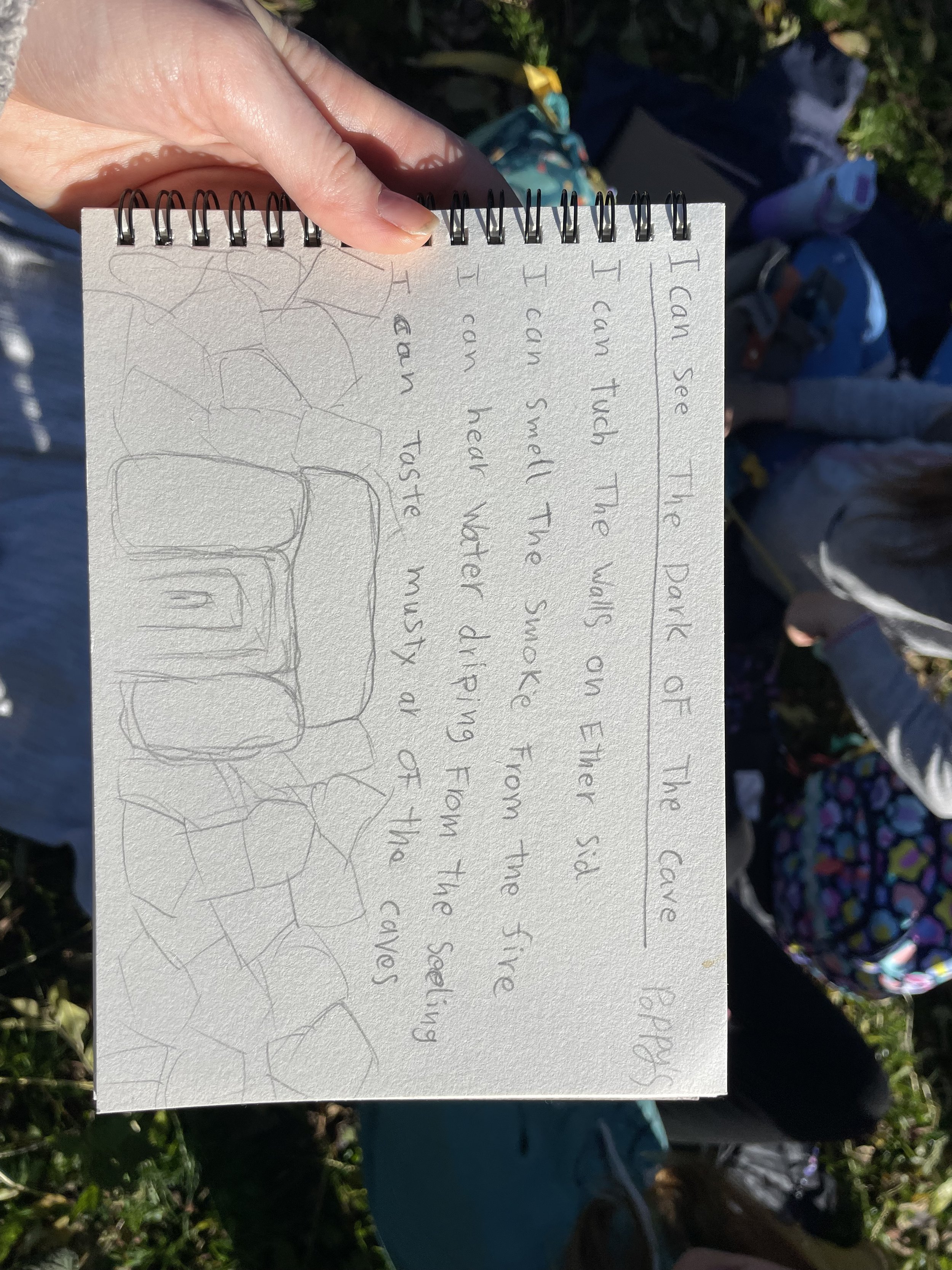 The visit to Halliggye Fogou provided participants with a unique opportunity to explore a heritage site distinct from the mining history typically associated with Redruth. Writer Sarah Connors guided them through sensory mapping activities, encouraging them to document what they could hear, see, and feel. Inside the fogou, they wrote short poems inspired by its atmosphere. Later, the group discussed the significance of places in their lives, reflecting on spaces they hoped would endure for future generations, from family homes to local landmarks like Kennel Vale and Wheal Coates.
